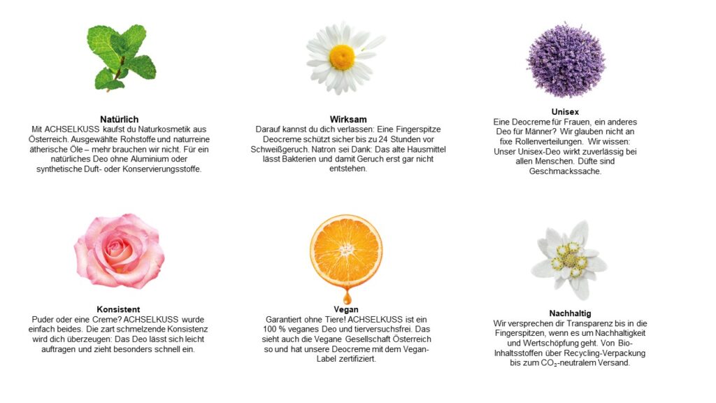 Weniger ist mehr!ACHSELKUSS Naturdeocrème ist sehr ergiebig: eine kleine Fingerspitze der veganen Deocrème sanft in die Achselhöhlen einzucremen reicht völlig aus, um zuverlässig den ganzen Tag vor Geruchsbildung geschützt zu sein.ACHSELKUSS zieht nach dem Auftragen sehr rasch ein und hinterlässt ein feines, pflegendes Gefühl auf der Haut ohne zu fetten oder Flecken zu hinterlassen.